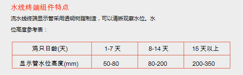 優(yōu)點(diǎn):懸掛組件全部采用熱鍍鋅處理。塑料配件采用原料,可大幅度延長(zhǎng)使用壽命。飲水乳頭和調(diào)壓器技術(shù)成熟,性能穩(wěn)定,能滿足肉雞及種雞飲水要求。